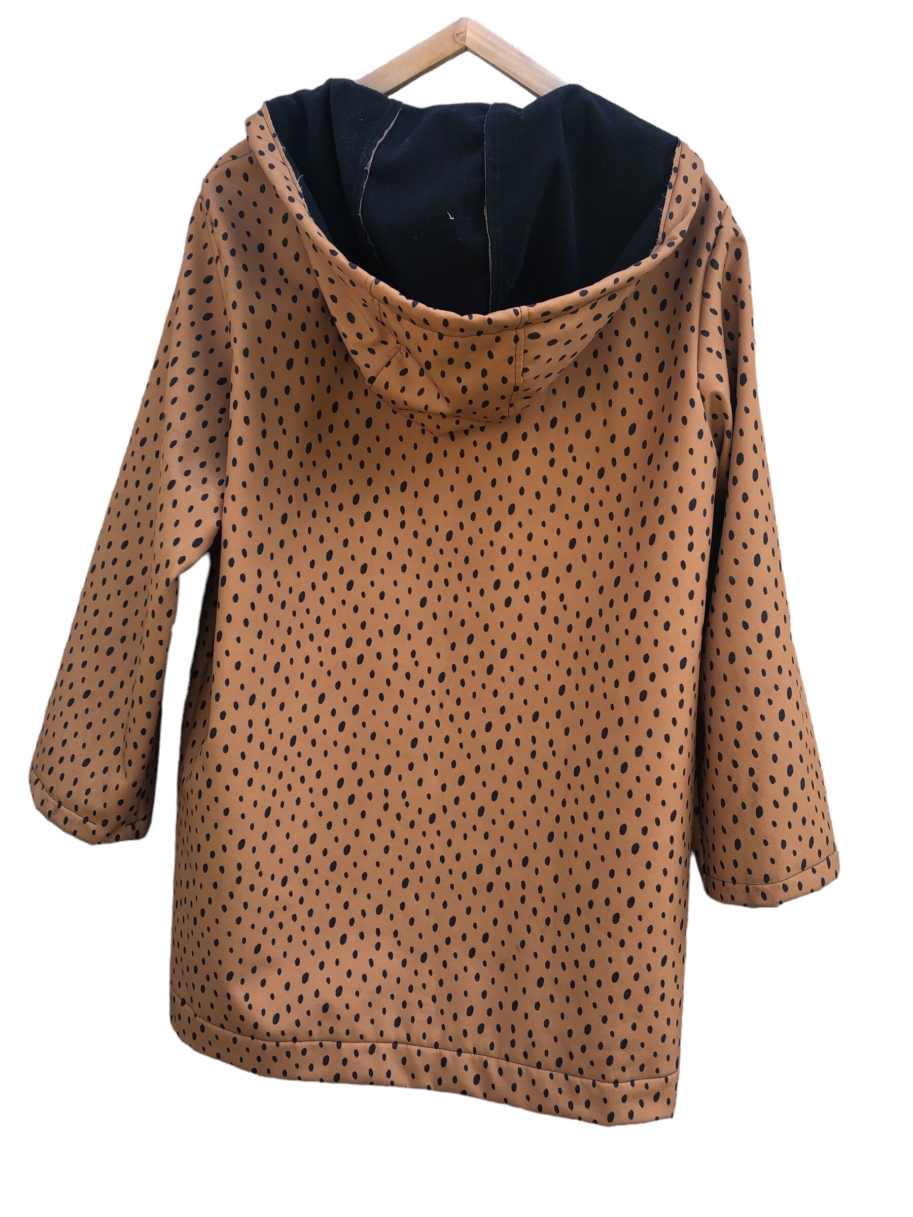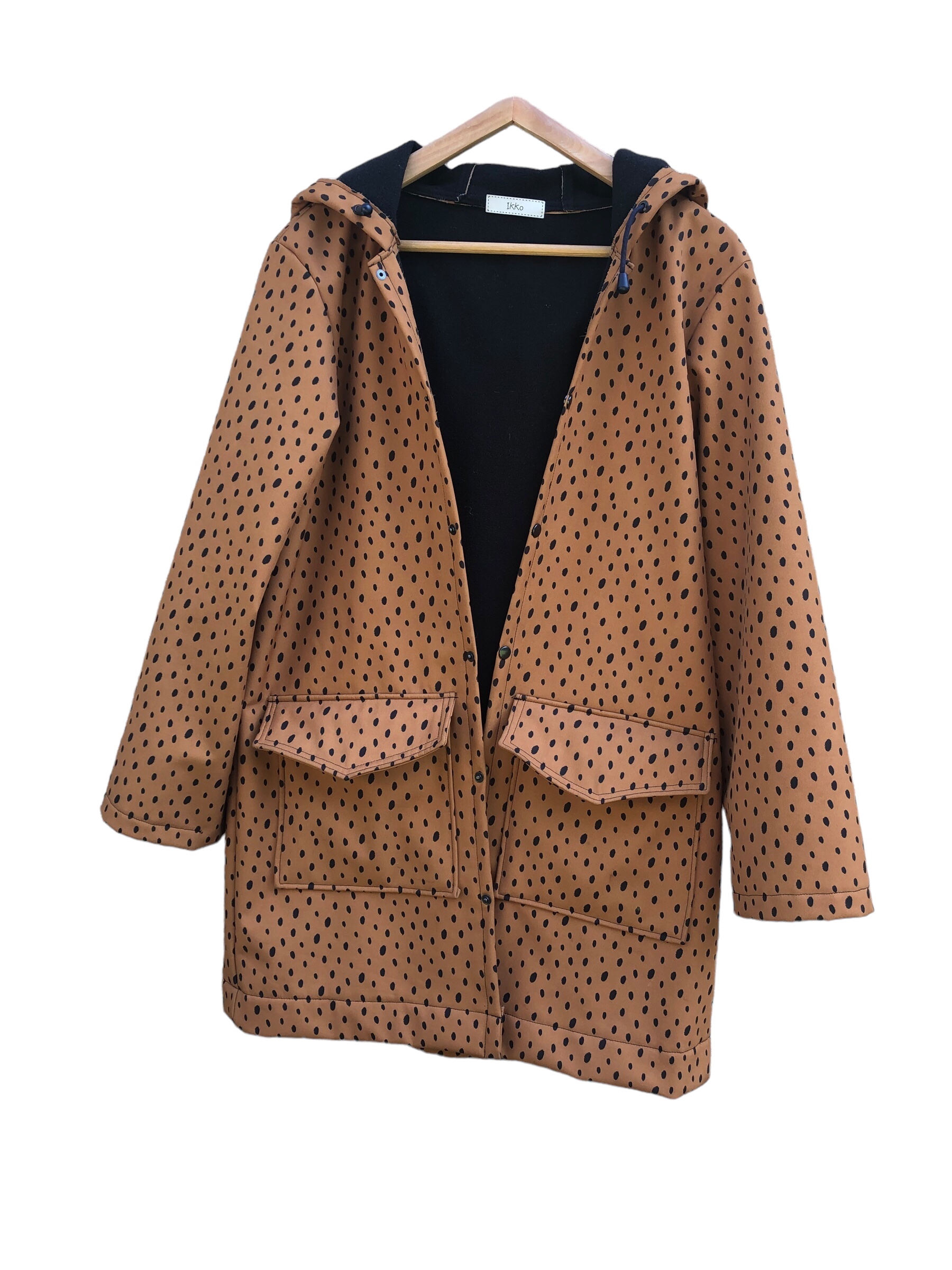 Imperméable unique, marron et point noir, poches plaquée sur le devant, accompagnée d’une capuche.